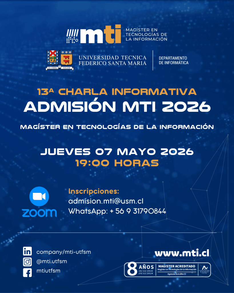 El jueves 07 de mayo, a las 19:00 horas, se llevará a cabo la decimotercera charla informativa del proceso de admisión al Magíster en Tecnologías de la Información (MTI) de la Universidad Técnica Federico Santa María.